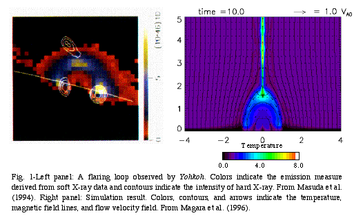 This work is based on one of the new observational findings by Yohkoh, which is a hard X-ray loop-top source formed over a soft X-ray flaring loop in a compact (impulsive) flare (Masuda et al. 1994; left panel in Figure 1). In order to clarify the generation mechanism of this loop-top source, we performed two-dimensional MHD simulations for reproducing relevant dynamic processes suggested by the so-called CSHKP model, a famous solar flare model based on magnetic reconnection. We found that a plasma jet originating from a reconnection point collided with an underlying closed loop to produce a standing fast-mode MHD shock wave, behind which a hot and dense source was generated and maintained (Magara et al. 1996; right panel in Figure 1). We confirmed that the temperature of this source is consistent with that derived from the hard X-ray data (about hundred million degrees) when thermal radiation is assumed and a realistic value of plasma β is used (β = 0.01) (Magara 1998). On the basis of these results, we discussed that difference in appearance between short-lived compact flares (impulsive flares) and long-duration-event flares (LDE flares) may depend on efficiency of the magnetic reconnection operating above the soft X-ray flaring loop (Magara et al. 1996).